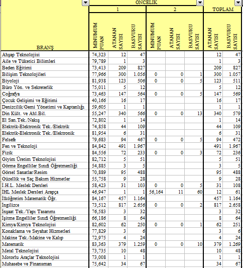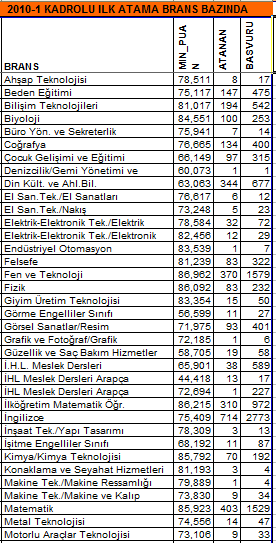 2010-1 kadrolu ilk atama sonucu oluşan minimum puanlar incelendiğinde en yüksek puanla kapatan branşın toplam 370 kişilik bir alımda 86.962 ile Fen ve Teknoloji branşının