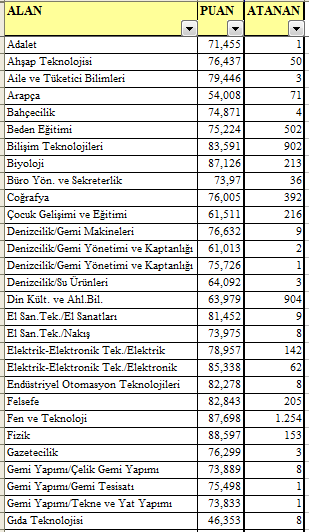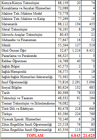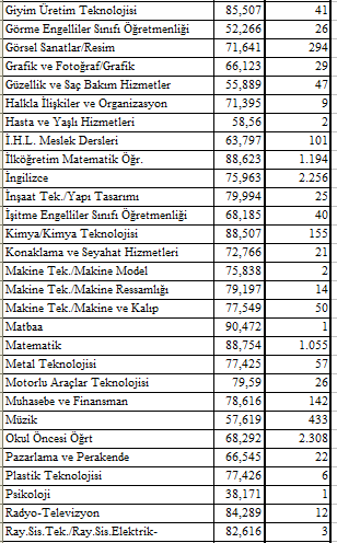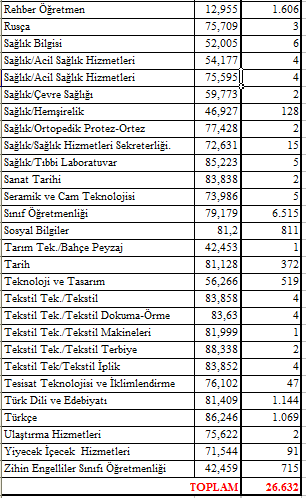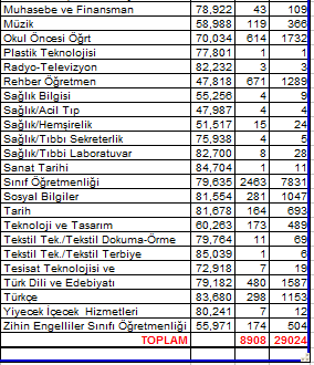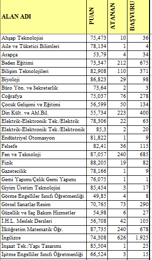 2010 Aralık sözleşmeli atamalar sonucu oluşan minimum puanlar ve kontenjanlar;