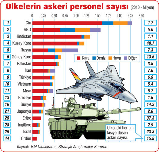 Dünyanın en büyük orduları sıralaması açıklandı! Birleşmiş Milletlere bağlı Uluslararası Stratejik Araştırmalar Kurumu tarafından dünyanın en büyük ordularının listesi açıklandı. askeri personel sayısına göre belirlenen listede Çin liste başı olurken Türk ordusu dokuzuncu sırada yerini aldı.