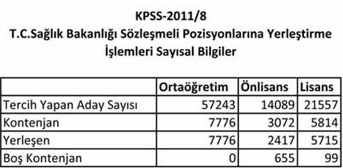 KPSS 2011/8 Sağlık Bakanlığı sözleşmeli pozisyonlara yerleştirme sonuçları açıklandı. buna göre tercih yapan 92889 adaydan 15908’i yerleşti. 754 kadro ise boş kaldı. adaylar yerleştirme sonuçlarını ÖSYM’nin http://sonuc.osym.gov.tr adresinden T.C kimlik numaraları ve şifrelerini girmek suretiyle öğrenebilecekler. ayrıca bir yerleştirme sonuç belgesi adayların adresine gönderilemeyecek. KPSS 2011/8 sözleşmeli pozisyonlara yerleştirme işlemlerine dair sayısal veriler şöyle;