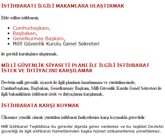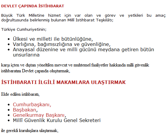MİT’in görevleri Milli İstihbarat Teşkilatının resmi sitesinde şöyle tanımlanmaktadır;