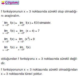 f fonksiyonu x = 3 noktasında tanımsız olduğundan x = 3 noktasında sürekli değildir ve türevi yoktur.