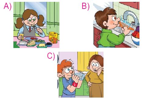 A seçeneğindeki görselde dengeli beslenen çocuk sağlığını korumaya dikkat etmektedir. B seçeneğindeki görselde sebzeleri yıkayarak tüketen çocuk sağlığını korumaya dikkat etmektedir. Terliyken soğuk su içmek sağlığımıza zarar verdiğinden C seçeneğindeki görselde bulunan çocuk sağlığını korumaya dikkat etmemektedir.