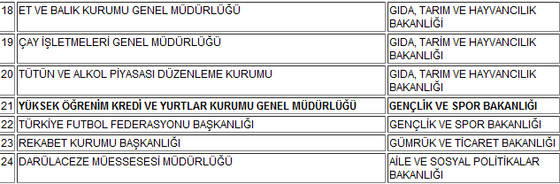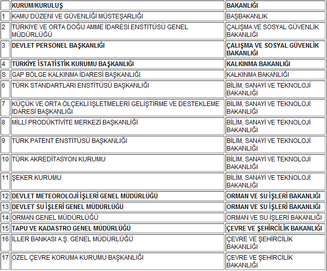 3046 sayılı Kanununda, 643 sayılı KHK ile yapılan yeni düzenlemeyle birlikte toplam 24 kurumun bağlı olduğu bakanlıklar yeniden düzenlendi. 8 temmuz 2011 tarihli resmi gazetede yayımlanan ve 24 kurumun bağlı bulunduğu bakanlıklarda yapılan değişiklikler şöyle;